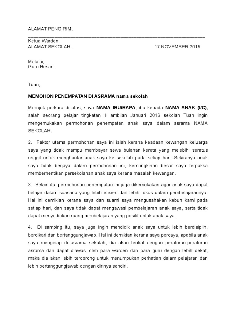 Contoh surat rayuan untuk memohon penempatan di asrama, terutamanya untuk pelajar yang berasal daripada keluarga miskin dan kurang berkemampuan. Contoh surat keberatan dari pihak ketiga terbaru | kali ini penulis kembali hadir untuk memberikan informasi seputar surat menyurat. Surat rayuan masuk asrama semula. Diskaun / pengurangan bayaran balik pinjaman boleh ubah via ibumifzal.com. Berhubung perkara di atas, saya nursyahira binti hassan bakri. Contoh surat rayuan permohonan kemasukan ke sekolah via www.slideshare.net. Bahagian pendidikan & latihan (pendidikan menengah), tingkat 19, bangunan medan mara, jalan raja laut. Surat rayuan ini bolehlah dihantar ke mrsm setelah keputusan rasmi permohonan masuk ke mrsm dikeluarkan. Contoh surat rayuan asrama penuh. Surat rayuan haji 2020, surat rayuan asrama, contoh surat rayuan, contoh surat rayuan pertukaran, contoh surat permohonan caruman lewat bayar perkeso (fclb) via www.scribd.com. Rafizi ramli ahli parlimen pandan dan naib presiden via rafiziramli.com. By justcallmefloeq in types > legal forms and rayuan asrama. Permohonan rayuan penempatan kolej semester 1 sesi 2015/2016.