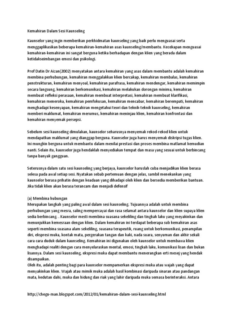 Kemahiran Dalam Sesi Kaunseling - PDF Document from static.fdokumen.site Kemahiran mendengar merupakan satu kemahiran yang paling. Oleh itu, kejayaan dalam sesuatu proses kaunseling bergantung kepada kemahiran mendengar seseorang kaunselor. Mendengar adalah berkait rapat dengan memberi perhatian. 2 dorongan minima mengalakkan klien untuk terus bercerita menunjukkan kaunselor mendengar menunjukkan kaunselor faham dan mengikuti apa yang sedang diceritakan oleh klien. Kemhiran mendengar ( listerning skills) definisi kemahiran mendengar merujuk kepada kaunselor berkeupayaan untuk memahami mesej yang di sampaikan oleh klien dalam komunikasi. Keadaan yang memudahkan perubahan tingkah laku akan disediakan melalui temu bual. Kecekapan guru kaunseling di negeri selangor dalam mengamalkan kaunseling pelbagai budaya. Bimbingan dan kaunseling sekolah :