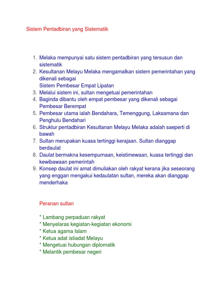 Sistem pentadbiran melayu tradisional sebelum campur tangan british membuktikan satu sistem pentadbiran yang sistematik. Sistem pentadbiran kesultanan melayu melaka berdasarkan sistem pembesar empat lipatan. F1 sistem pentadbiran yang teratur. Melalui sistem ini, sultan mengetuai. Pentadbiran yang sistematik pusat pengembangan agama islam perluasan kuasa pusat perdagangan pusat kegiatan ilmu kematangan hubungan luar pentadbiran yang sistematik pembesar berempat pembesar berlapan pembesar enam belas pembesar tiga puluh dua.