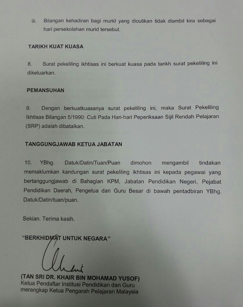 Harap dapat surat pekeliling ini disampaikan kepada semua guru besar sekolah menengah danrendah untuk panduan dan tindakan mereka.berkhidmat untuk negara saya yang menurut perintah,2.